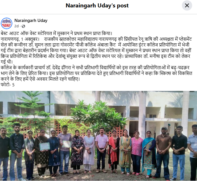 Ist Prize in Best Out of Waste Competition Organised at Govt PG College Ambala Cantt.